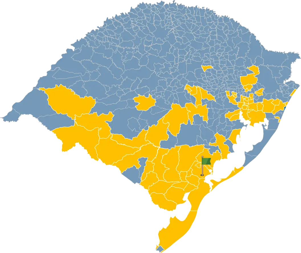Alegrete, Alvorada, Arroio do Padre, Arroio do Sal, Arroio Grande, Arvorezinha, Bagé, Balneário Pinhal, Brochier, Caçapava do Sul, Cachoeira do Sul, Cachoeirinha, Camaquã, Campo Bom, Candiota, Canguçu, Canoas, Capão do Leão, Caraá, Caxias do Sul, Cerrito, Dom Pedrito, Eldorado do Sul, Estância Velha, Esteio, Glorinha, Gravataí, Guaíba, Harmonia, Herval, Herveiras, Igrejinha, Ivoti, Jaguarão, Lavras do Sul, Montenegro, Morro Redondo, Nova Petrópolis, Nova Santa Rita, Novo Hamburgo, Osório, Pareci Novo, Pedras Altas, Pedro Osório, Pelotas, Pinheiro Machado, Piratini, Portão, Porto Alegre, Rio Pardo, Rio Grande, Rosário do Sul, São José do Norte, São José do Sul, São Leopoldo, São Lourenço do Sul, Sapiranga, Sapucaia do Sul, Santa Cruz do Sul, Santa Maria, Santa Vitória do Palmar, Santana do Livramento, Santo Antônio da Patrulha, Sinimbu, Tapes, Três Coroas, Turuçu, Venâncio Aires, Viamão e Xangri-lá.